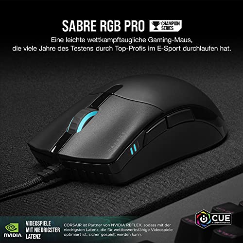 CORSAIR SABRE RGB PRO CHAMPION SERIES Kabelgebundene Ultra-Light FPS/MOBA Gaming Maus – 18.000 DPI – Ergonomisches Design – iCUE Kompatibel – PC, Mac, PS5, PS4, Xbox – Schwarz