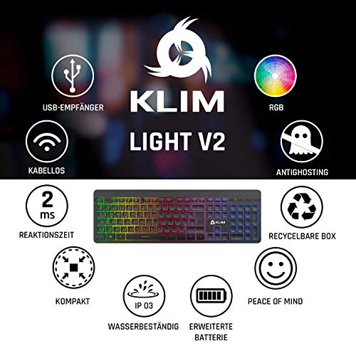 Specification: KLIM Light V2 Gaming Tastatur Kabellos QWERTZ + NEU 2023 + flach, ergonomisch, dezent, wasserresistent + Beleuchtete Gaming Tastatur für PC Mac PS4 PS5 + Integrierter Akku mit Langer Lebensdauer