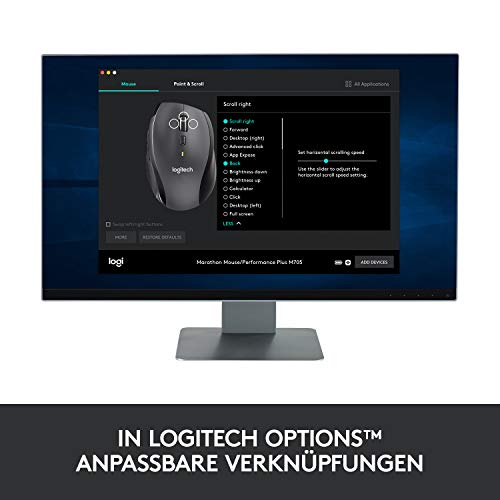 The Logitech® Marathon Mouse M705 just keeps running … on and on. It uses significantly less power than comparable wireless mice from other sellers, allowing a full three years of service life between two battery changes. Furthermore, it uses a wireless receiver that is so tiny that it can be permanently plugged into the computer so that the mouse is always ready to use – at any time, anywhere, and as long as necessary. In addition, hyper-fast scrolling allows you to fly through long documents to find what you are looking for. Laser quality tracking ensures smooth, responsive cursor control. The hand-friendly shape optimised for the right hand ensures that the hand still feels just as good in the end as it did in the beginning.The battery indicator is dependent on use.