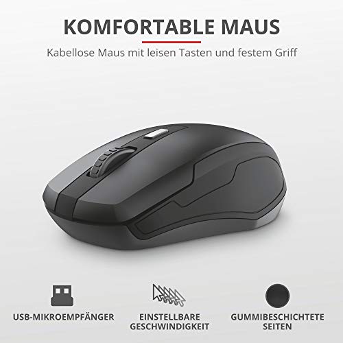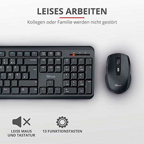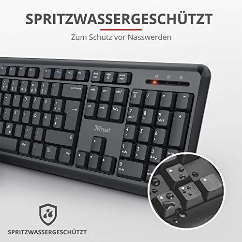 Trust Ymo Tastatur Maus Set Kabellos, Deutsches QWERTZ Layout, Leise Tasten und Maustasten, Spritzwassergeschützt, Funkmaus mit DPI-Taste, USB-Empfänger, PC, Laptop, Windows, macOS – Schwarz
