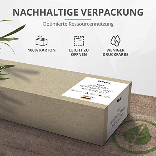 Specification: Trust Ymo Tastatur Maus Set Kabellos, Deutsches QWERTZ Layout, Leise Tasten und Maustasten, Spritzwassergeschützt, Funkmaus mit DPI-Taste, USB-Empfänger, PC, Laptop, Windows, macOS – Schwarz