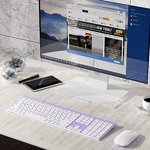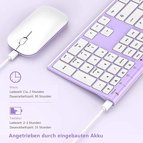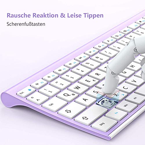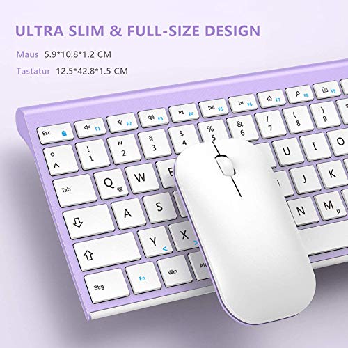 Specification: Kabellose Tastatur und Maus Set Ultradünn, 2.4G Wireless Wiederaufladbare Maus Tastatur, Flache Funktastatur mit Deutschem Layout für Windows, PC, Laptop, Smart TV, Weiß und Lila